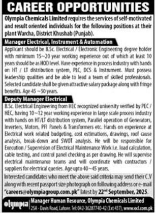 Olympia Chemicals Limited announced new jobs for the position of Manager Electrical Instrument Automation, Deputy Manager Electrical. These jobs are related to Management category and Government jobs. The minimum qualification required for this job is Bachelor, BS.