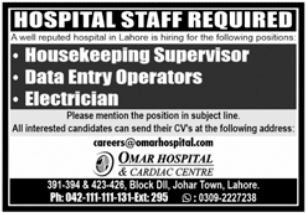 Omar Hospital & Cardiac Center announced new jobs for the position of House Keeping Supervisor, Data Entry Operator, Electrician. These jobs are related to Management category and Government jobs. The minimum qualification required for this job is Intermediate, Bachelor, BS.