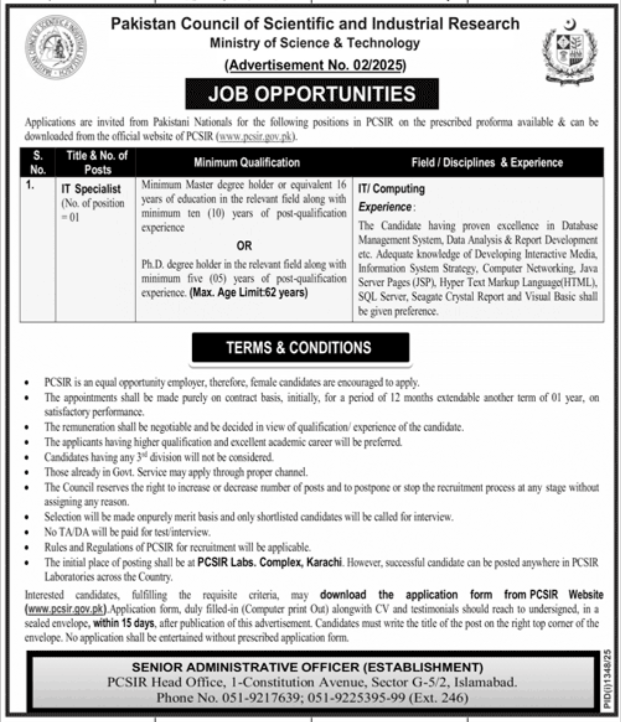 Pakistan Council of Scientific and Industrial Research PCSIR announced new jobs for the position of It Specialist. These jobs are related to IT category and Government jobs. The minimum qualification required for this job is Bachelor, Master, Mphil, Phd.