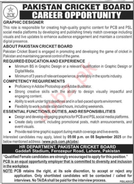 Pakistan Cricket Board PCB announced new jobs for the position of Graphic Designer. These jobs are related to Design category and Government jobs. The minimum qualification required for this job is Bachelor, Master.