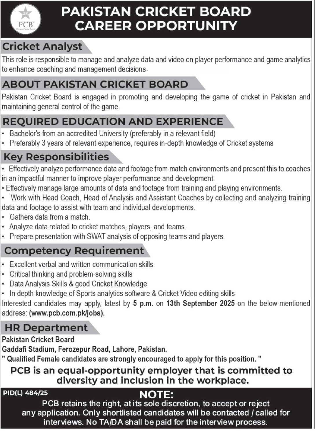 Pakistan Cricket Board PCB announced new jobs for the position of Cricket Analyst. These jobs are related to Management category and Government jobs. The minimum qualification required for this job is Bachelor.