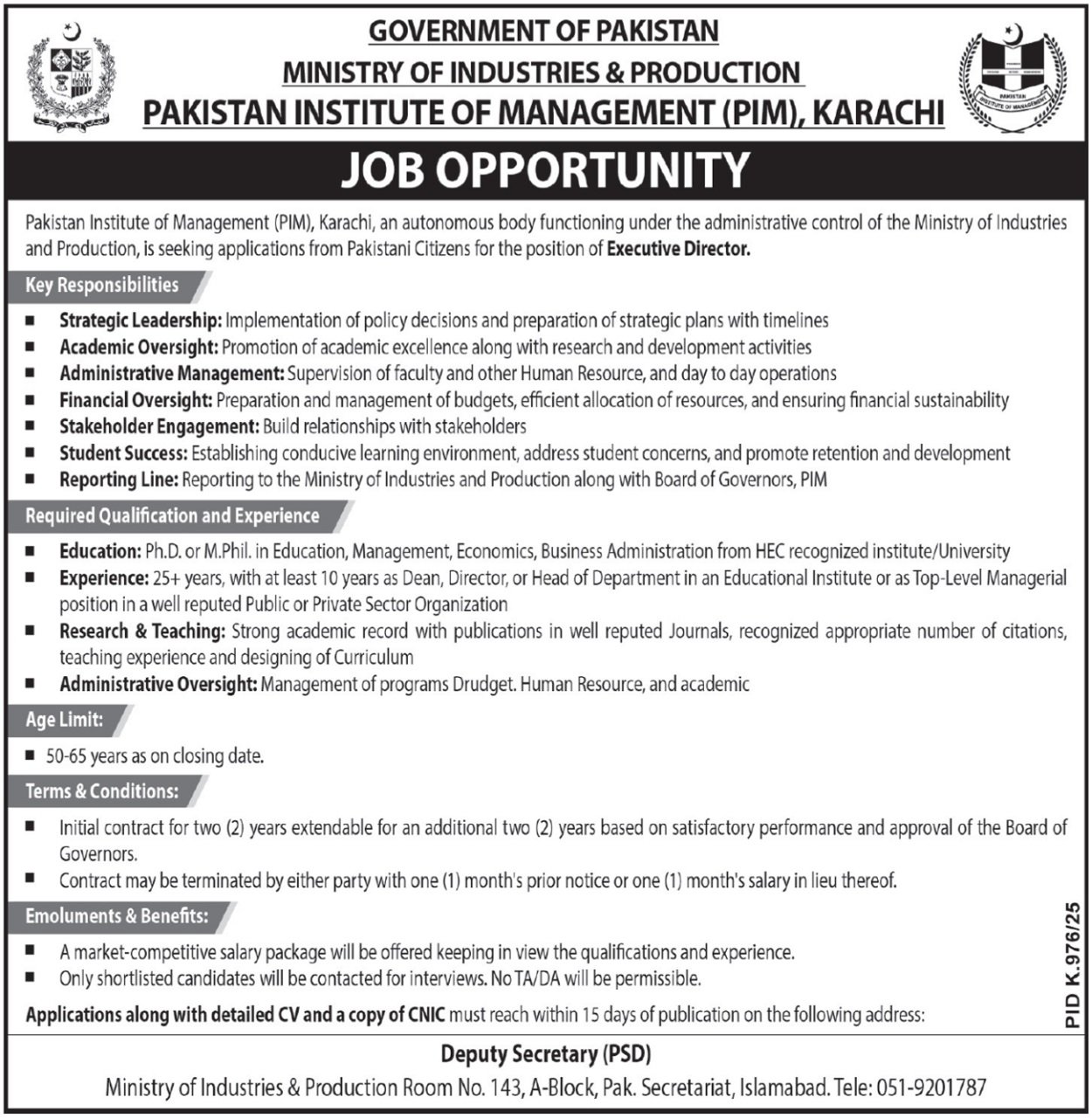 Ministry of Industries and Production announced new jobs for the position of Executive Director. These jobs are related to Executive category and Government jobs. The minimum qualification required for this job is Mphil, Phd.