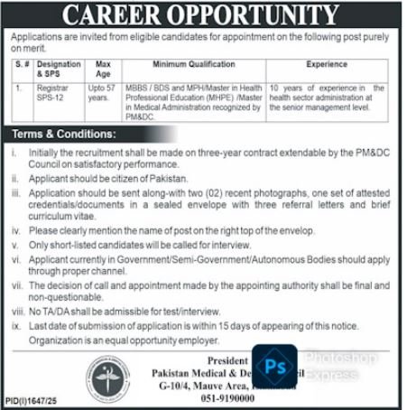 Pakistan Medical and Dental Council announced new jobs for the position of Registrar. These jobs are related to Management category and Government jobs. The minimum qualification required for this job is MBBS.