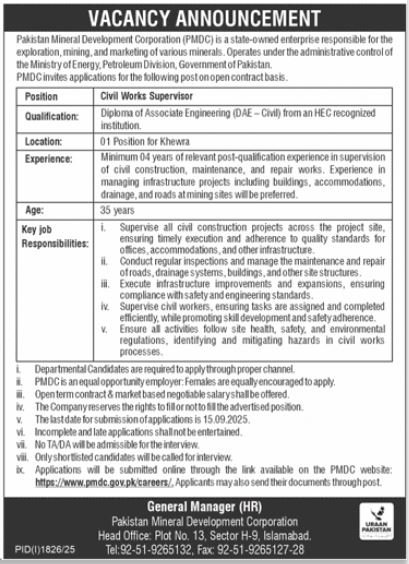 Pakistan Mineral Development Corporation announced new jobs for the position of Civil Works Supervisor. These jobs are related to Management category and Government jobs. The minimum qualification required for this job is Bachelor, Master, MS, BS.