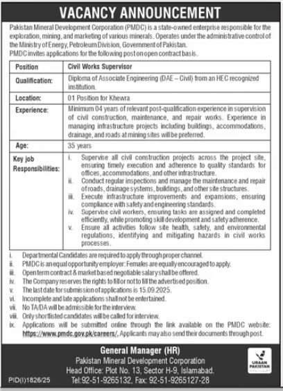 Pakistan Mineral Development Corporation announced new jobs for the position of Civil Works Supervisor. These jobs are related to Management category and Government jobs. The minimum qualification required for this job is Bachelor, Master.