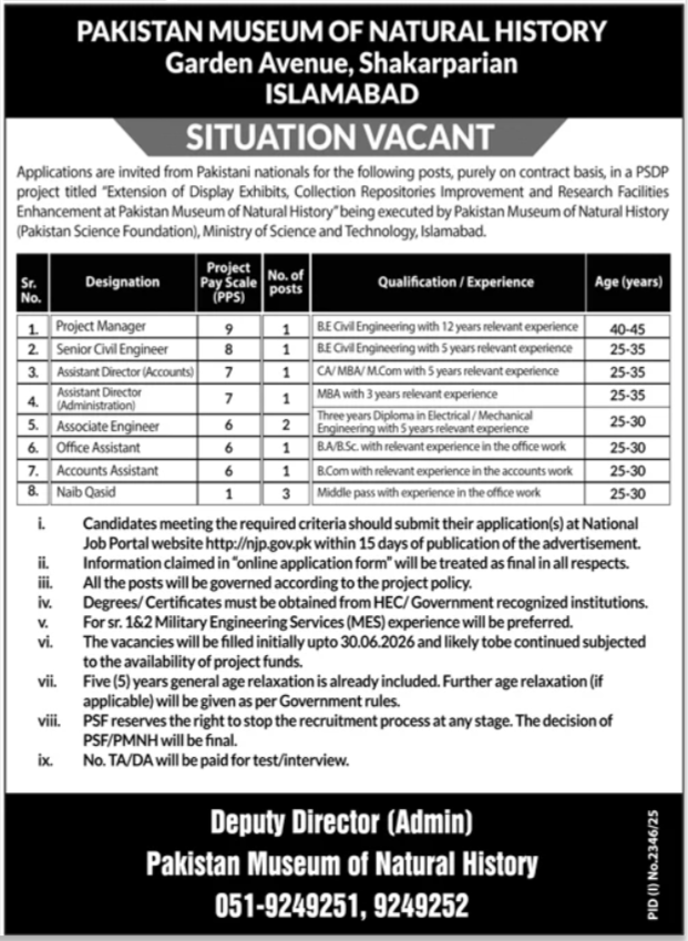 Pakistan Museum of Natural History announced new jobs for the position of Project Manager, Civil Engineer, Assistant Director, Assistant Director Accounts, Assistant Director Administration, Associate Engineer, Office Assistant, Accounts Assistant, Naib Qasid. These jobs are related to Management category and Government jobs. The minimum qualification required for this job is Middle, Intermediate, Bachelor, BA, B.com, M.com, MBA, DAE, CA, B.E, Others, BS.