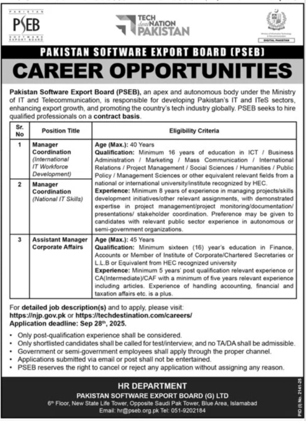 Pakistan Software Export Board PSEB announced new jobs for the position of Manager Coordination, Assistant Manager Corporate Affairs. These jobs are related to Management category and Government jobs. The minimum qualification required for this job is Bachelor, Master, MS, BS.