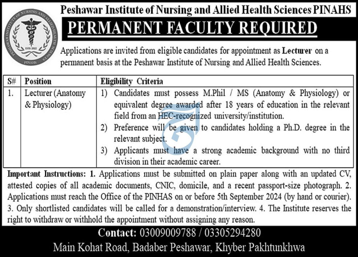 Peshawar Institute of Nursing & Allied Health Sciences PINAHS announced new jobs for the position of Lecturer, Lecturer Anatomy, Lecturer Physiology. These jobs are related to Education category and Government jobs. The minimum qualification required for this job is Bachelor, Master, Mphil, MS, BS.