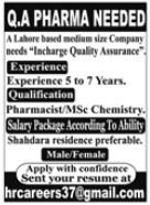 Pharmaceutical Company announced new jobs for the position of Incharge Quality Assurance. These jobs are related to Management category and Government jobs. The minimum qualification required for this job is Bachelor, BS.