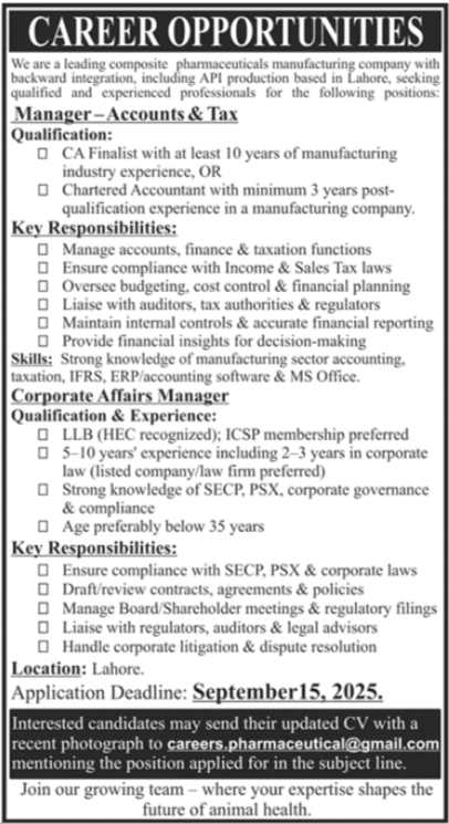 Pharmaceutical Company announced new jobs for the position of Manager Account Tax, Corporate Affairs Manager. These jobs are related to Management category and Government jobs. The minimum qualification required for this job is Bachelor, Master, MS, BS.