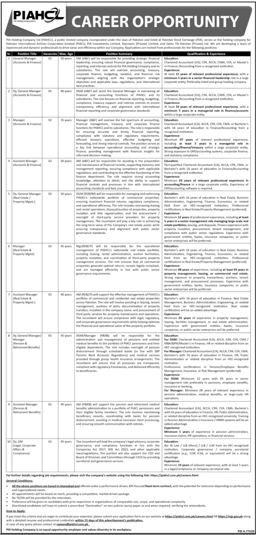 PIA Holding Company Limited announced new jobs for the position of GM Accounts & Finance, Dy General Manager Accounts & Finance, Manager Accounts & Finance, Assistant Manager Accounts & Finance, Dy General Manager Real Estate & Property Mgmt., Manager Real Estate & Property Mgmt., Assistant Manager Real Estate & Property Mgmt., Dy General Manager, Manager Retirement Benefits, Assistant Manager Retirement Benefits, Dy GM Corporate Affairs & Compliance. These jobs are related to Management category and Government jobs. The minimum qualification required for this job is Bachelor, Master, M.com, MBA, LLb, ACCA, LLM, BS.