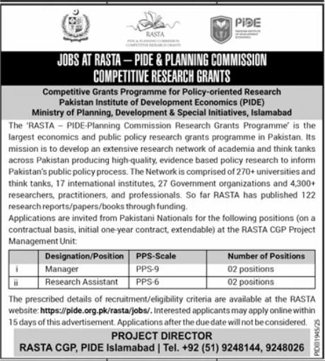 Ministry of Planning Development and Special Initiative announced new jobs for the position of Manager, Research Assistant. These jobs are related to Management category and Government jobs. The minimum qualification required for this job is Bachelor, Master.