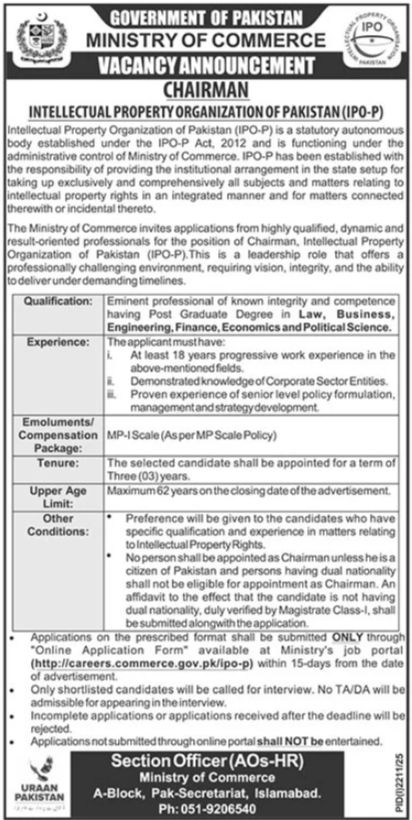 Ministry of Commerce announced new jobs for the position of Chairman. These jobs are related to Management category and Government jobs. The minimum qualification required for this job is Bachelor, Master.