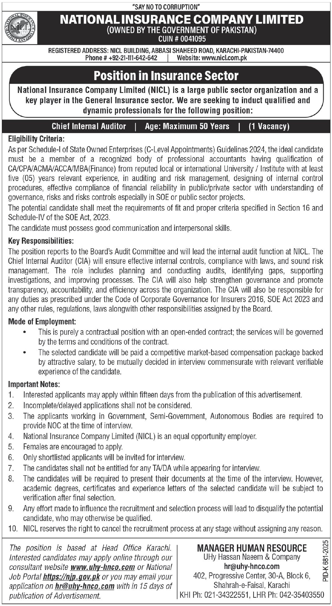 National Insurance Company Limited NICL announced new jobs for the position of Chief Internal Auditor. These jobs are related to Accounting category and Government jobs. The minimum qualification required for this job is MBA, ACCA, CA.