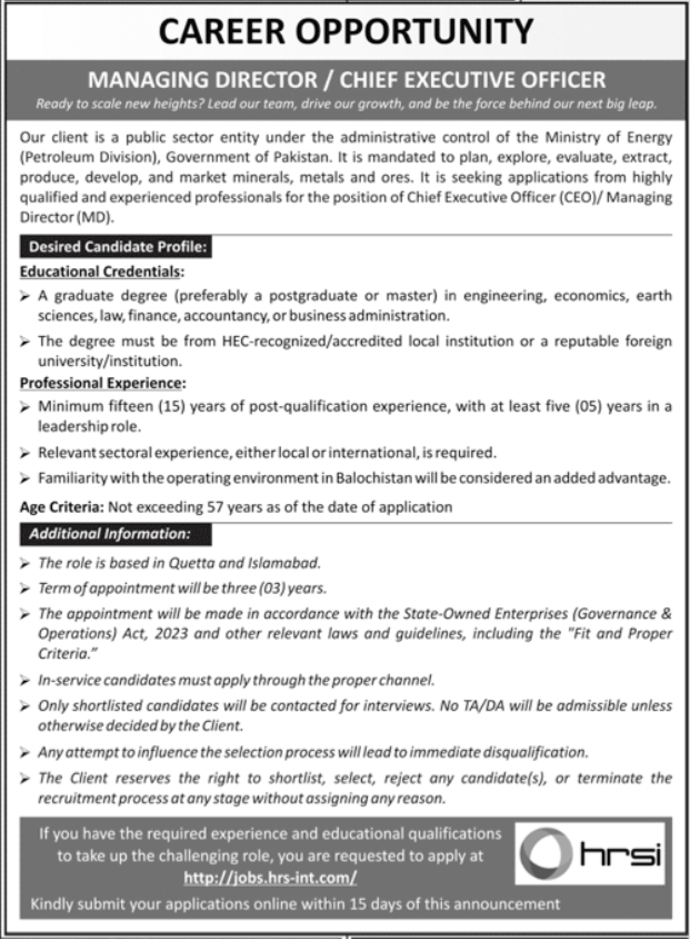 Human Resource Solutions International HRSI announced new jobs for the position of Managing Director, Chief Executive Officer. These jobs are related to Management category and Government jobs. The minimum qualification required for this job is Bachelor, Master.