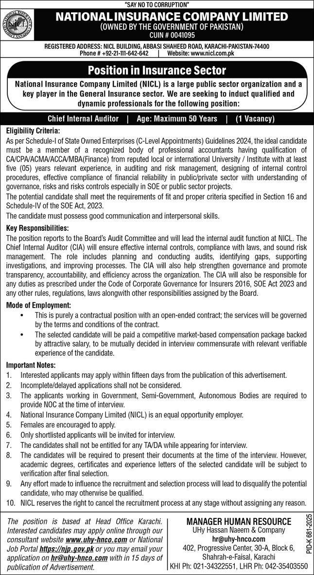 National Insurance Company Limited NICL announced new jobs for the position of Chief Internal Auditor. These jobs are related to Management category and Government jobs. The minimum qualification required for this job is MBA, ACCA.