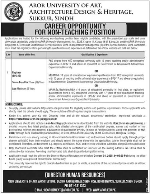 Aror University of Art Architecture Design & Heritage announced new jobs for the position of Registrar. These jobs are related to Management category and Government jobs. The minimum qualification required for this job is Phd.