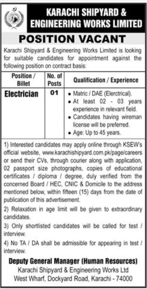 Karachi Shipyard and Engineering Works Limited announced new jobs for the position of Electrician. These jobs are related to Management category and Government jobs. The minimum qualification required for this job is Matric, DAE.