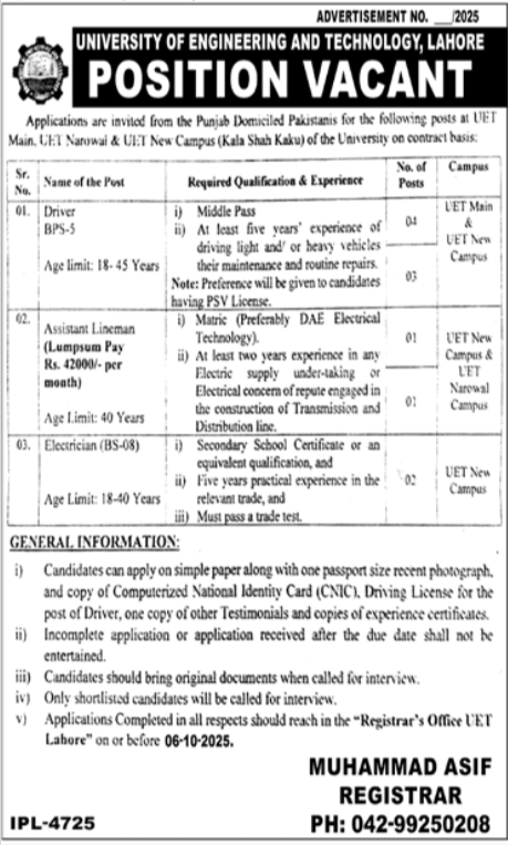 University of Engineering and Technology UET announced new jobs for the position of Driver, Assistant Lineman, Electrician. These jobs are related to Management category and Government jobs. The minimum qualification required for this job is Middle, Matric, DAE.