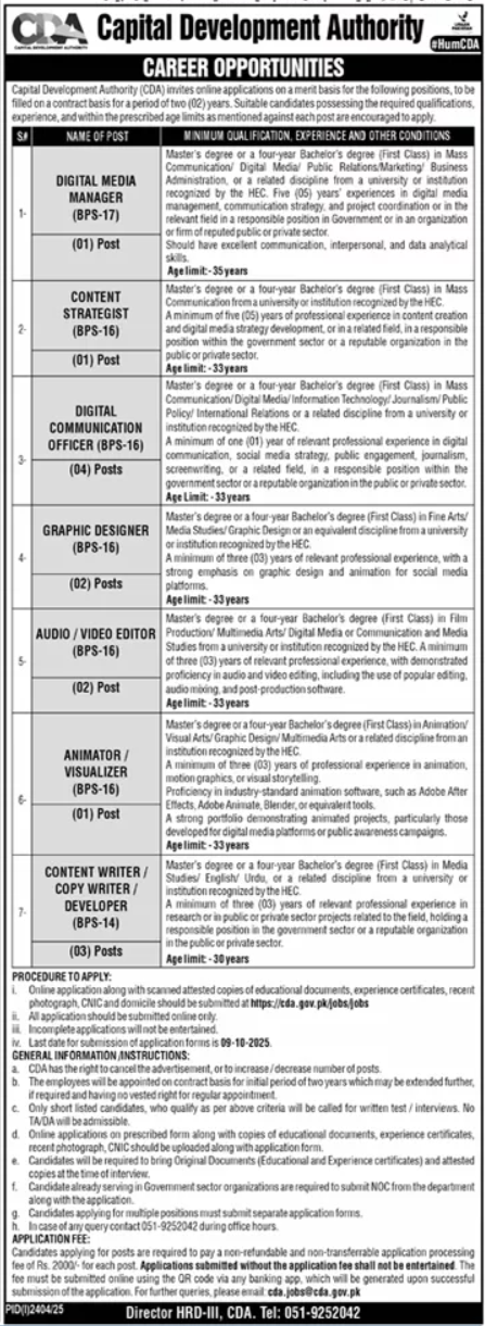 Capital Development Authority CDA announced new jobs for the position of Digital Media Manager, Content Strategist, Digital Communication Officer, Graphic Designer, Audio Editor, Video Editor, Animator, Content Writer, Copy Writer, Developer. These jobs are related to Management category and Government jobs. The minimum qualification required for this job is Master.