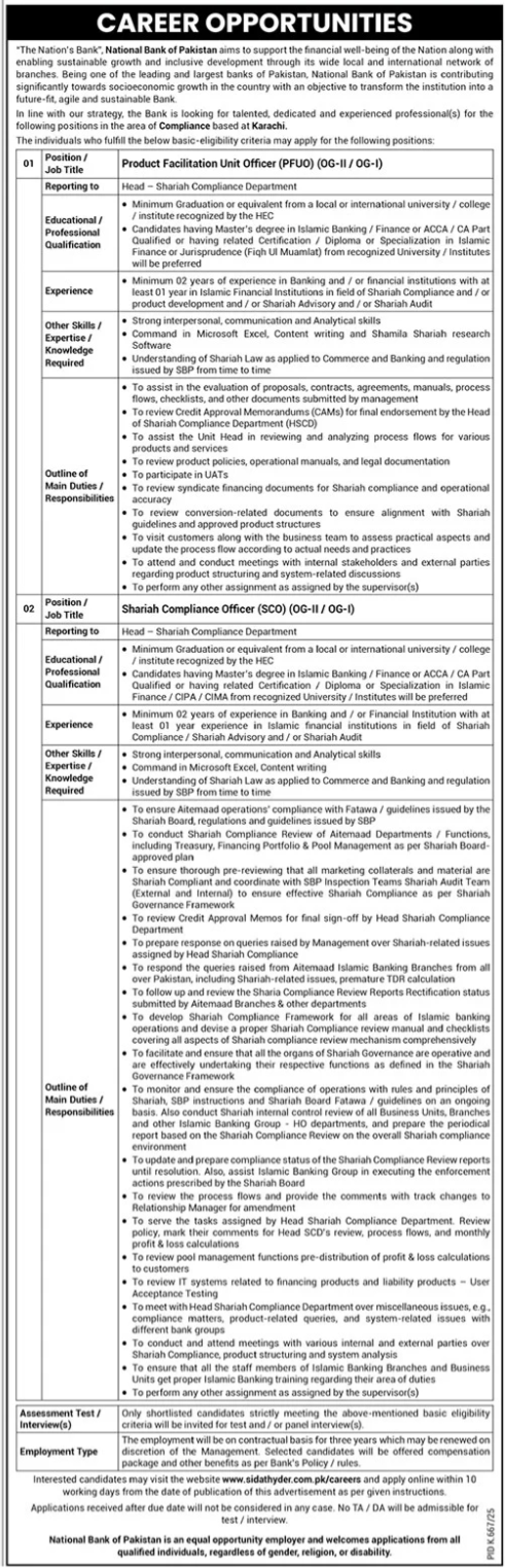National Bank of Pakistan NBP announced new jobs for the position of Product Facilitation Unit Officer, Shariah Compliance Officer. These jobs are related to Management category and Government jobs. The minimum qualification required for this job is Bachelor, Master.
