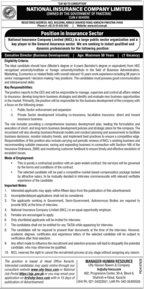 National Insurance Company Limited NICL announced new jobs for the position of Executive Director Business Development. These jobs are related to Management category and Government jobs. The minimum qualification required for this job is Bachelor, Master.