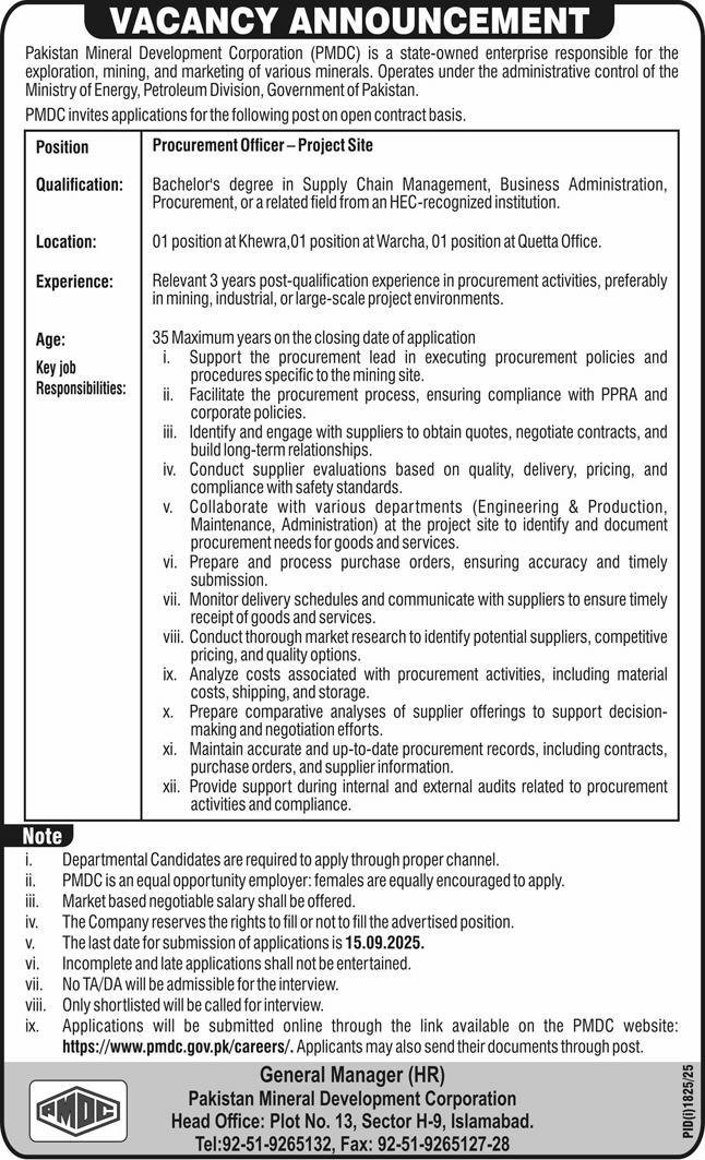 Pakistan Mineral Development Corporation announced new jobs for the position of Procurement Officer. These jobs are related to Management category and Government jobs. The minimum qualification required for this job is Bachelor.
