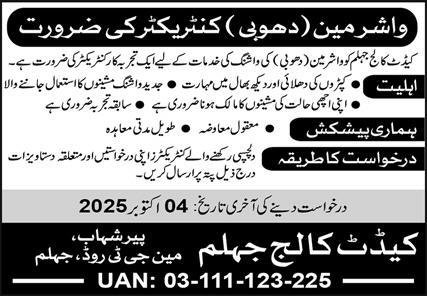 Cadet College announced new jobs for the position of Washerman Contractor. These jobs are related to Management category and Government jobs. The minimum qualification required for this job is Middle.