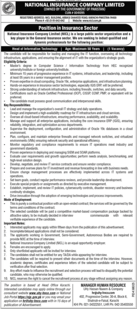 National Insurance Company Limited NICL announced new jobs for the position of Head Of Information Technology. These jobs are related to Management category and Government jobs. The minimum qualification required for this job is Master.