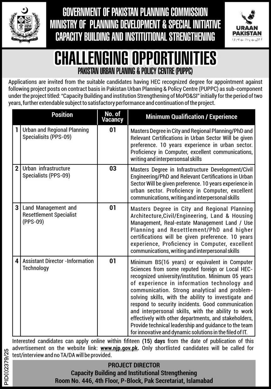 Ministry of Planning Development and Special Initiative announced new jobs for the position of Urban Regional Planning Specialist, Urban Infrastructure Specialist, Land Management Resettlement Specialist, Assistant Director Information Technology. These jobs are related to Management category and Government jobs. The minimum qualification required for this job is Master, BS.