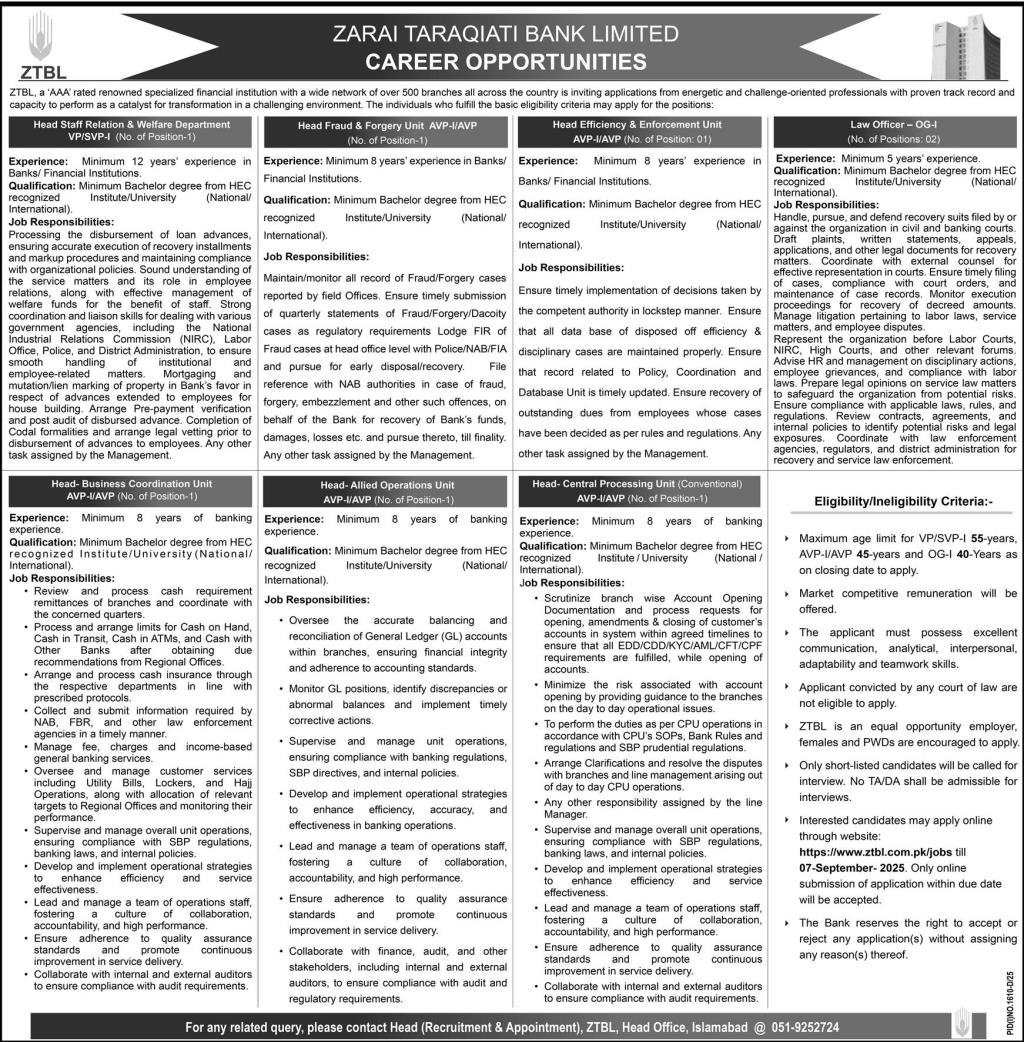 Zarai Taraqiati Bank Limited ZTBL announced new jobs for the position of Head Staff Relation & Welfare Department, Head Fraud & Forgery Unit, Head Efficiency Enforcement Unit, Law Officer, Head Business Coordination Unit, Head Allied Operations Unit, Head Central Processing Unit. These jobs are related to Management category and Government jobs. The minimum qualification required for this job is Bachelor, Master.