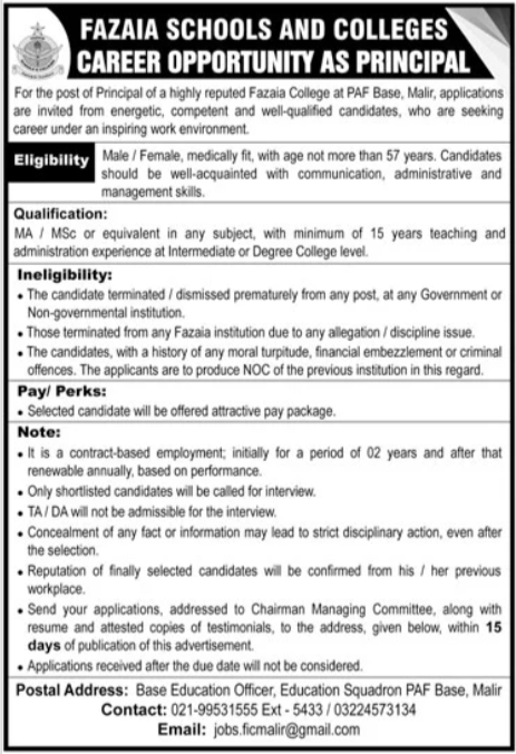 Fazaia College announced new jobs for the position of Principal. These jobs are related to Management category and Government jobs. The minimum qualification required for this job is MA, M.sc.