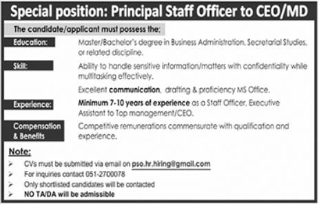 Public Sector Organization announced new jobs for the position of Principal Staff Officer. These jobs are related to Management category and Government jobs. The minimum qualification required for this job is Bachelor, Master.
