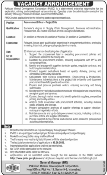 Pakistan Mineral Development Corporation announced new jobs for the position of Procurement Officer. These jobs are related to Management category and Government jobs. The minimum qualification required for this job is Bachelor, Master.