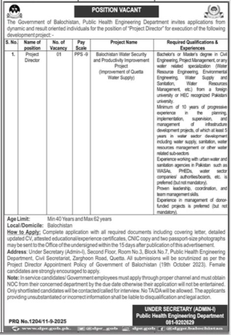 Public Health Engineering Department announced new jobs for the position of Project Director. These jobs are related to Management category and Government jobs. The minimum qualification required for this job is Bachelor, BS.