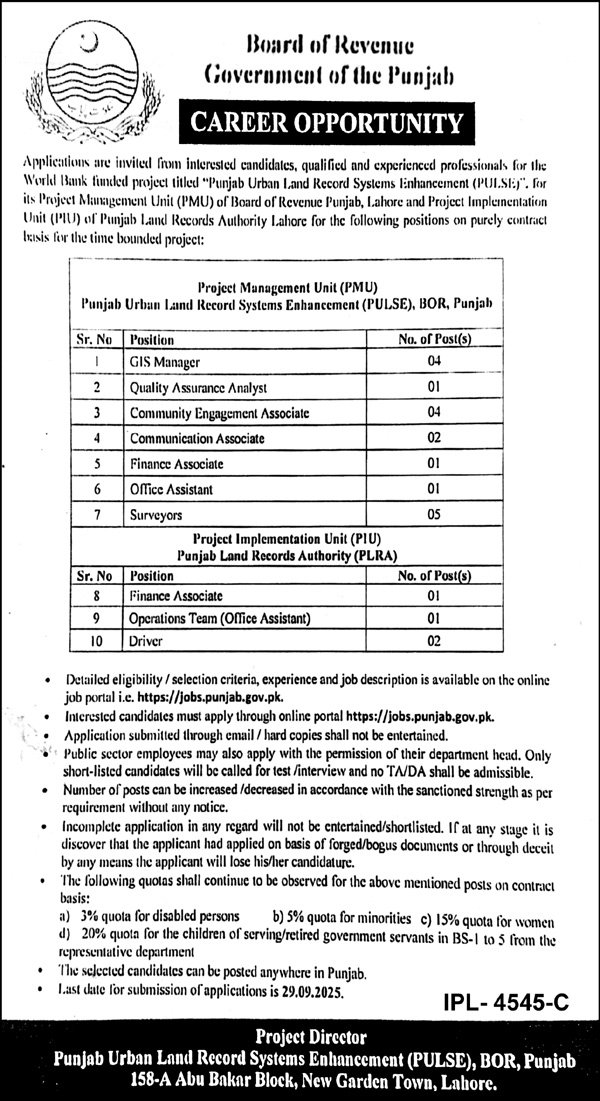 Punjab Board of Revenue announced new jobs for the position of Gis Manager, Quality Assurance Analyst, Community Engagement Associate, Communication Associate, Finance Associate, Office Assistant, Surveyor, Operation Team, Driver. These jobs are related to Management category and Government jobs. The minimum qualification required for this job is Middle, Matric, Intermediate, Bachelor, Master, BS.