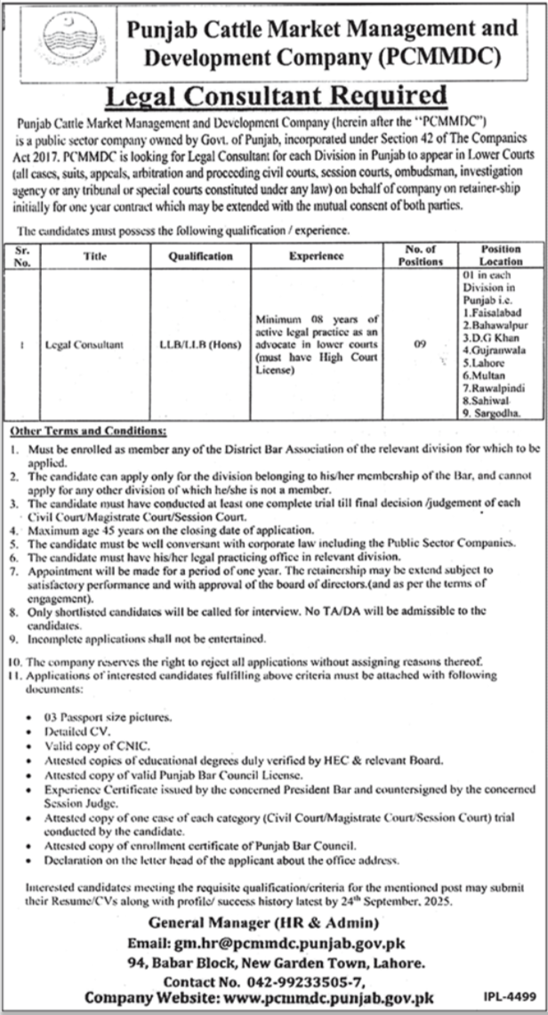 Punjab Cattle Market Management & Development Company announced new jobs for the position of Legal Consultant. These jobs are related to Legal category and Government jobs. The minimum qualification required for this job is Bachelor, LLb.
