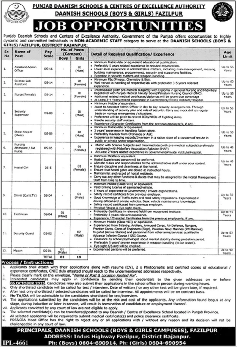 Punjab Daanish Schools & Center Of Excellence Authority announced new jobs for the position of Assistant Admin Officer, Science Lab Assistant, Nurse, Female Nurse, Security Supervisor, Store Keeper, Store Keeper Mess, Nursing Attendant, Aid Nurse, Hostel Girl, Driver, Car Driver, Ltv Driver, Electrician, Security Guard, Mason. These jobs are related to Education category and Government jobs. The minimum qualification required for this job is Primary, Middle, Matric, Intermediate, DAE, Others.