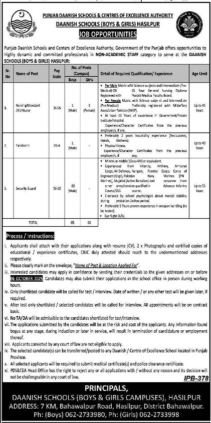 Punjab Daanish Schools & Center Of Excellence Authority announced new jobs for the position of Nurse, Tandorchi, Security Guard. These jobs are related to Education category and Government jobs. The minimum qualification required for this job is Middle, Matric, Intermediate.
