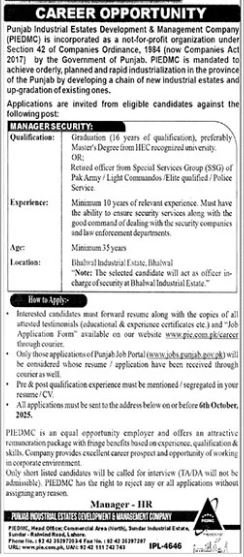 Punjab Industrial Estates Development and Management Company PIEDMC announced new jobs for the position of Manager Security. These jobs are related to Management category and Government jobs. The minimum qualification required for this job is Bachelor, Master, MS, BS.