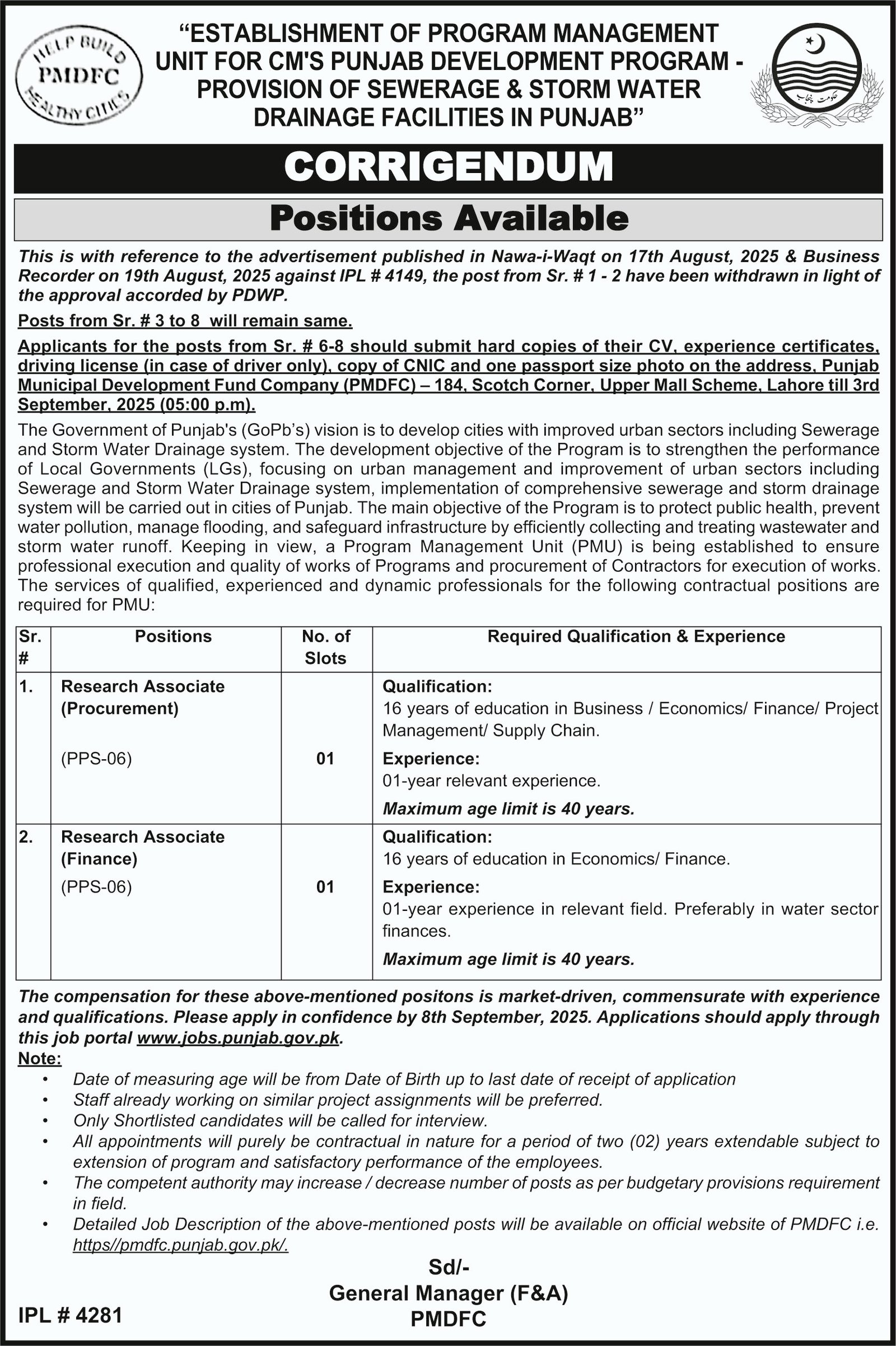 Punjab Municipal Development Fund Company PMDFC announced new jobs for the position of Research Associate. These jobs are related to Management category and Government jobs. The minimum qualification required for this job is Bachelor, Master, MS, BS.