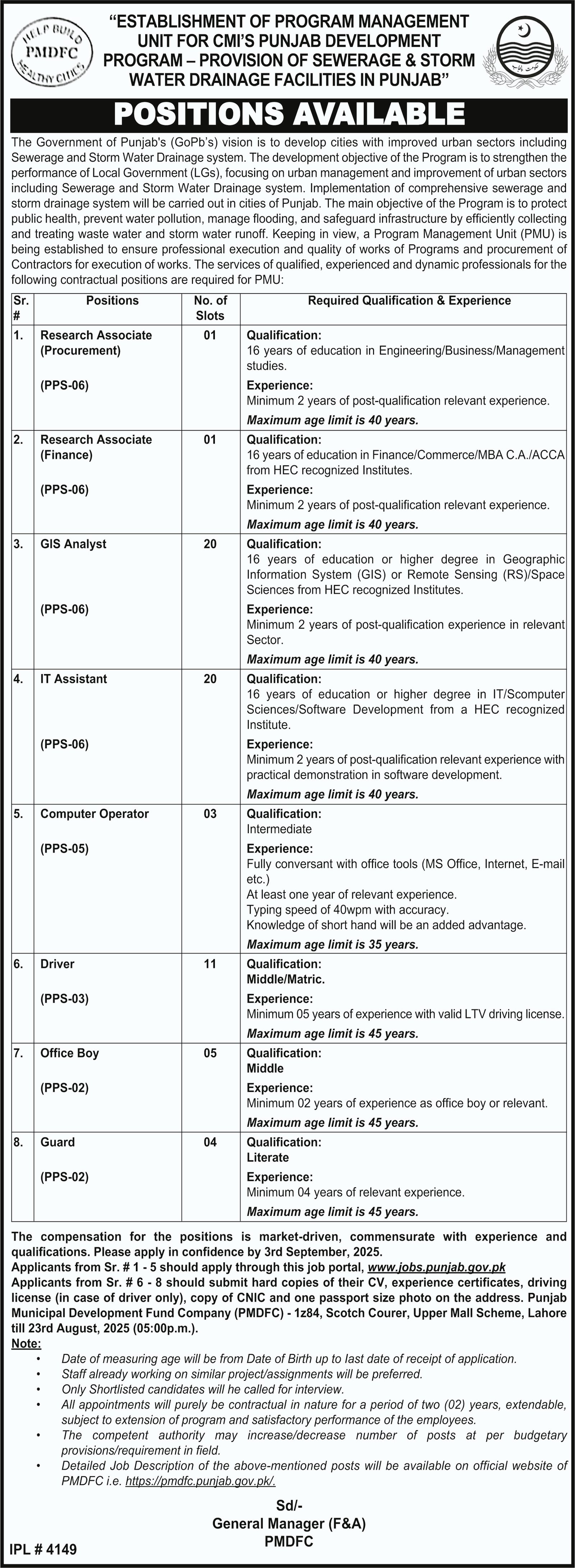 Punjab Municipal Development Fund Company PMDFC announced new jobs for the position of Research Associate, Gis Analyst, It Assistant, Computer Operator, Driver, Office Boy, Guard. These jobs are related to Management category and Government jobs. The minimum qualification required for this job is Matric, Intermediate, Bachelor, Master, MS, BS.