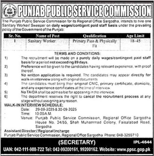 Punjab Public Service Commission PPSC announced new jobs for the position of Sanitary Worker. These jobs are related to Labor category and Government jobs. The minimum qualification required for this job is Primary, Middle.