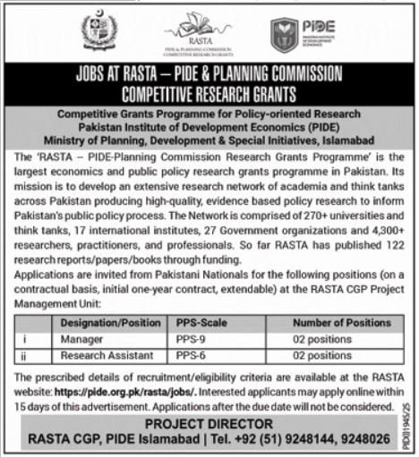 Pakistan Institute of Development Economics PIDE announced new jobs for the position of Manager, Research Assistant. These jobs are related to Management category and Government jobs. The minimum qualification required for this job is Bachelor, Master.