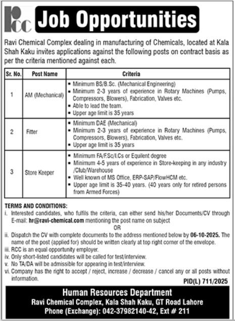 Ravi Chemical Complex announced new jobs for the position of Am Mechanical, Fitter, Store Keeper. These jobs are related to Management category and Government jobs. The minimum qualification required for this job is Intermediate, Bachelor, DAE.