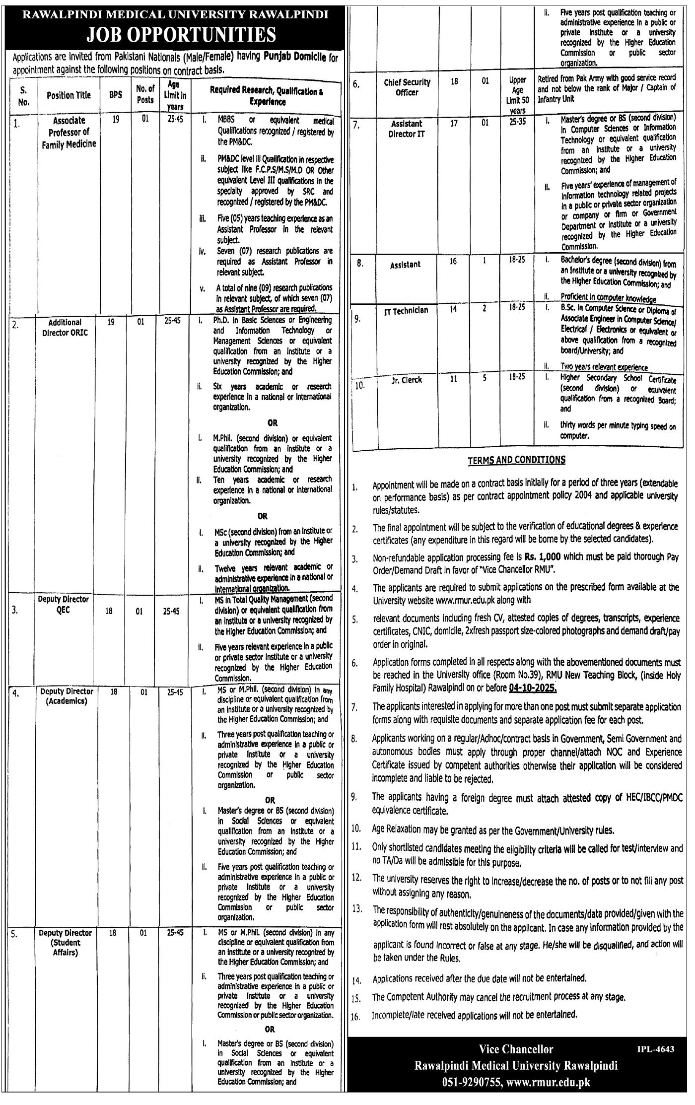 Rawalpindi Medical University RMU announced new jobs for the position of Associate Professor, Associate Professor Family Medicine, Additional Director, Additional Director Oric, Deputy Director Qec, Deputy Director Academics, Deputy Director Student Affairs, Chief Security Officer, Assistant Director It, Assistant, It Technician, Clerk. These jobs are related to Education category and Government jobs. The minimum qualification required for this job is Intermediate, Bachelor, Master, Mphil, Phd, MBBS, M.sc, MS, Others, BS.