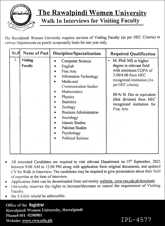Rawalpindi Women University RWU announced new jobs for the position of Visiting Faculty. These jobs are related to Education category and Government jobs. The minimum qualification required for this job is Bachelor, Master, Mphil, Phd.