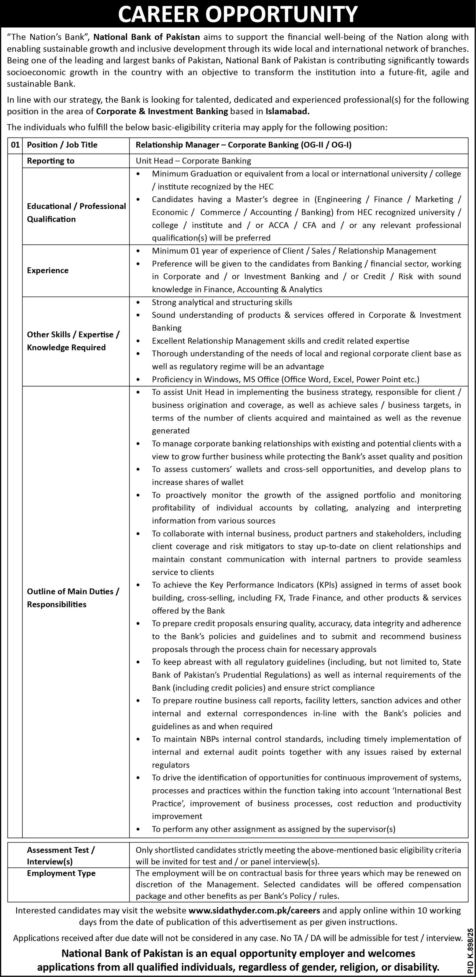 National Bank of Pakistan NBP announced new jobs for the position of Relationship Manager. These jobs are related to Management category and Government jobs. The minimum qualification required for this job is Bachelor, Master.