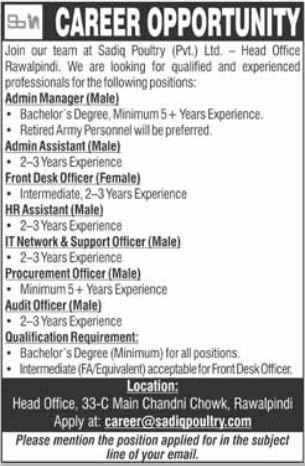 Sadiq Poultry Pvt Limited announced new jobs for the position of Admin Manager, Admin Assistant, Front Desk Officer, Hr Assistant, It Network Support Officer, Procurement Officer, Audit Officer. These jobs are related to Management category and Government jobs. The minimum qualification required for this job is Bachelor, Master, MS, BS.