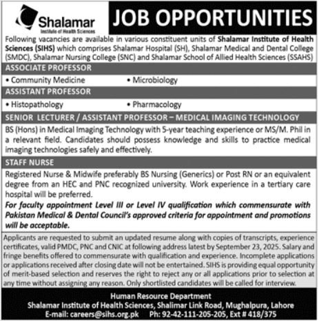 Shalamar Institute of Health Sciences announced new jobs for the position of Associate Professor, Assistant Professor, Lecturer, Staff Nurse. These jobs are related to Education category and Government jobs. The minimum qualification required for this job is Bachelor, Master, Mphil, MBBS, MS, BS.